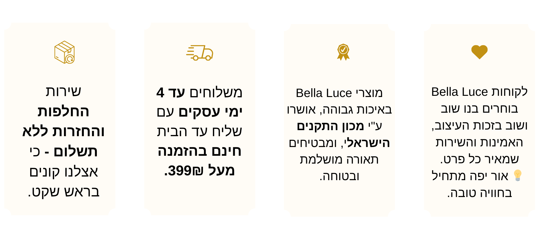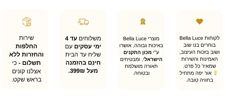 המשלוח שלנו אורך עד 4 ימי עסקים, מה שמבטיח שתקבלו את גוף התאורה שלכם בהקדם האפשרי.